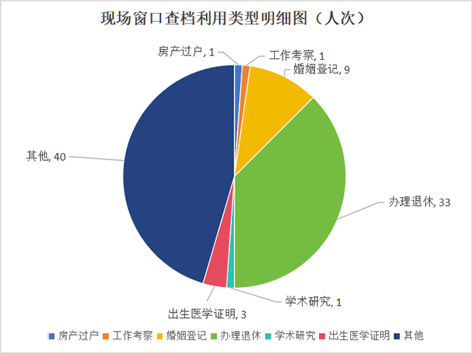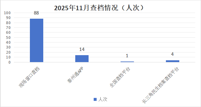 市档案馆认真落实“泰好查”查档服务理念,查档利用共107人次,利用档案资料128卷,复印档案页数295页。群众满意度达到100%。 各渠道查档情况如下:现场窗口查档共计88人次,从服务需求来看,为办理退休业务的查档需求仍占比最高,占总查档人次的37.5%。线上查档总计19人次,其中,泰州通APP查档14人次,占线上查档总量的73.7%,出生医学证明档案查询(4人次)和婚姻档案查询(10人次);长三角民生档案查档平台查档4人次;全国查档平台查档1人次,线上查档利用方式均为出证邮寄,为上海、福建等地的群众实现了“零跑腿”办理,大幅提升了服务效率。 现场查档未查到所需档案的共有11人次,主要是工作证明、婚姻等方面档案,未能查找到的原因是群众所需档案不在进馆范围且年代久远,针对这种情况,工作人员积极提供相关查询建议。 |