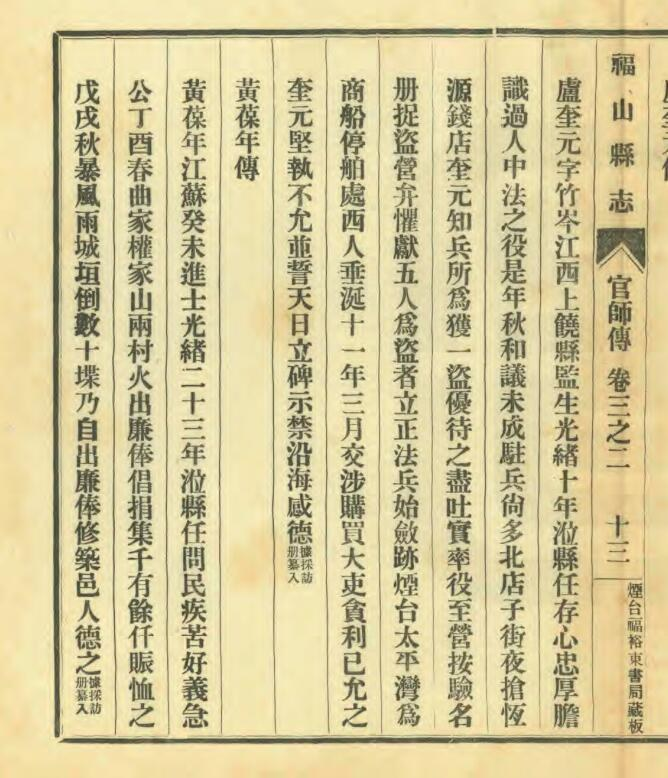 · ·人 物 春 秋· 黄葆年,字锡朋,一作隰朋,号希平,泰州 姜堰人,生于清道光二十五年 ( 1845 ) 九月初一, 兄弟七人,排行老三,故又称黄三先生,光绪九 年 ( 1883 ) 进士。光绪十二年起,历任山东临淄、 滋阳、朝城、莱阳、滕县、福山、泗水等知县。 光绪二十八年,回乡扫墓,后辞官,初居泰兴刁 铺东皋草堂,后在苏州葑门十全街创立归群草堂 讲学。 1924 年病逝,葬于苏州城外七子山。著有 《黄氏遗书》《天籁集》《归群草堂诗集》《归群草 堂语录》《归群草堂函稿续编》 等。 问道求学,拜师太谷学派 太谷学派始创于清嘉庆道光年间,创始人为 安徽池州人周毂 ( 1762 — 1832 ),字星垣,号太谷。 太谷学派自认儒家道统,但实际上受到了儒、佛、 道以及其他民间宗教等多种思想的影响。学派重 视对人性、社会关系等方面的探讨和认识,强调 人与自然、人与社会的和谐共生,提倡仁者爱人、 修养道德。在学派的思想体系中,既有儒家的仁 义道德观念,又融合了佛家的禅定思想和道家的 自然观念。这种学术与宗教的交融,使太谷学派 超出了传统儒学的范围,成为一个具有一定宗教 色彩的民间学术团体。学派注重培养学生的修身、 齐家、治国、平天下的全面素养,主要活动地点 在江苏扬州、泰州、苏州和山东黄崖等地,鼎盛 时信徒达万众。直到解放初,苏州、泰州、泰县 等地仍有太谷学派的传人在讲学。 道光十二年周毂逝世,遗命弟子张积中还道 于北,李光炘传道于南。咸丰七年 ( 1857 ) 张积 中讲学于山东肥城黄崖山,创立北宗;同治三年 ( 1864 ) 李光炘讲学于宜陵龙川草堂,创立南宗。 当年, 19 岁的黄葆年在同乡好友蒋文田的引荐下, 拜李光炘为师。黄葆年视李光炘为孔孟道统的传 人,对李光炘始终保持着崇敬甚至是膜拜的态度, 认为人生得圣人为师、得善人为友可以无憾矣。 在众多弟子中,黄葆年也最受李光炘的器重,李 曾作诗 《赠黄生隰朋》 曰:“可能他日为吾长,不 愧天生黄隰朋”。 同治五年十月,“黄崖事变”爆发,张积中举 家殉难,二百弟子从死,北宗几近覆没。南宗受 其牵连,亦作鸟散。同治七年九月初九南宗诸子 重集泰州,制定“牧马归群”目标。“黄崖事变” 后,在扬州、泰州一带讲学的李光炘担忧受到牵 连,辗转奔波于江淮之间。光绪十一年,李光炘 在泰州去世。此后,太谷学派传承进入以黄葆年 和蒋文田为首的第三代。 仕宦山东,坚持勤廉为民 光绪十二年,黄葆年以进士任山东临淄县令, 此后辗转于滋阳、朝城、莱阳、滕县、福山、泗 太谷学派传人黄葆年 ■ 顾 伟 39