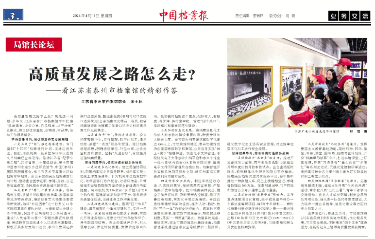 4月11日,《中国档案报》第三版“局馆长论坛”栏目,以《高质量发展之路怎么走?——看江苏省泰州市档案馆的精彩作答》为题,推介我市档案高质量发展做法和成效。